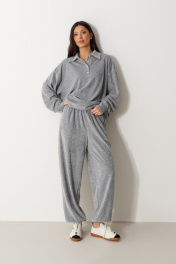Джемпер прямого кроя выполнен из трикотажного полотна серого цвета. Характеристики: горловина круглая с отложным воротником и планкой-ПОЛО, застегивающейся на пробивные петли и пришивные пуговицы, линия плеча спущенная, рукав втачной с притачной манжетой по низу. Длина рукава 58см, длина изделия 67см.