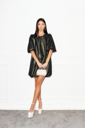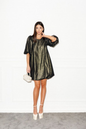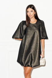 Платье свободного кроя выполнено из ткани с металлизированной нитью цвета золото. Объемные акцентные рукава, мерцающая металлизированная нить позволит Вам создать образ на вечер, свободный комфортный крой позволит трансформировать платье для каждодневного образа. Характеристики: свободный крой, А образный силуэт, подкладка, горловина овальная, рукава акцентные объёмные, низ рукава с декоративным подгибом на резинке, застежка по заднему полотну на петлю пуговичку, низ изделия с подгибом. Длина по спинке 85 см, длина рукава 42 см.