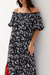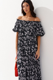 Летнее платье с полуоткрытыми плечами выполнено из черного полотна с контрастным цветочном принтом. Характеристики: свободный крой, А образный силуэт, горловина по передней части изделия и по спинке на резинке со сборкой, рукав свободного кроя, низ рукава на резинке. Длина по спинке 132 см.