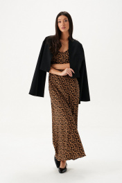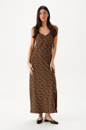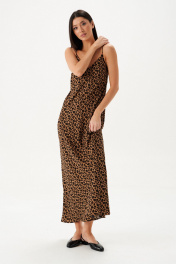 Платье-макси. Выполнено из мягкой плательной ткани с анималистичным принтом. Полуприлегающий силуэт, декольте - V-образный вырез, бретели регулируемые. Без подкладки. В области груди и спинки ткань двуслойная. Длина спинки 123 см