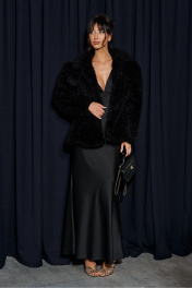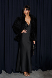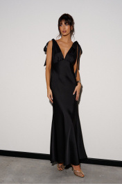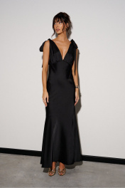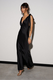 Платье-макси выполнено из атласного полотна чёрного цвета. Характеристики: А-образный силуэт, двойной лиф, переходит в завязки на спинку, юбка свободного кроя с подкладкой. Длина юбки 116 см.