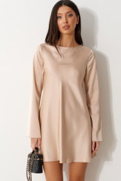Платье короткое. Выполнено из тонкого атласа в жемчужно-бежевом оттенке. Характеристика: По полочке вырез лодочкой, по спинке глубокая качель с перемычкой по центру. По верху горловины спинки шнурки-завязки. Рукав длинный, одношовный, втачной, с расклешением к низу. Низ юбки с расклешением к низу. Длина рукава 65 см, длина платья по спинке от плеча 84 см.