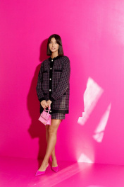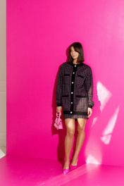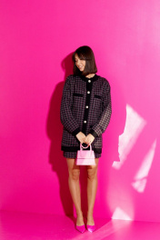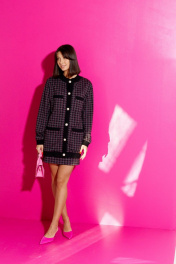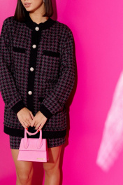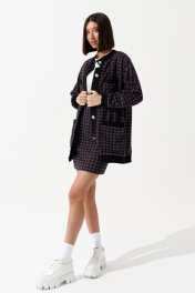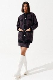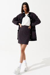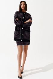 Комплект выполнен из трикотажной ткани состоит из жакета и юбки. Характеристики жакет прямой , свободный крой, подкладка, удлиненный, горловина стойка, застежка центральная на петли пуговицы, пуговицы крупные декоративные, рукав втачной по низу рукава манжета, по переду функциональные карманы. Детали: по периметру горловины, по центру изделия, по низу притачная планка из довяза на трикотажной основе , манжета выполнена так же довязом на трикотажной основе. Юбка прилегающего силуэта на подкладке, пояс стабильный, застежка потайная тесьма молния в среднем шве заднего полотна изделия. Длина джемпера 73, длина рукава 71 от края горловины, длина юбки 50.