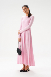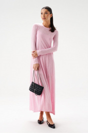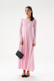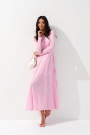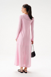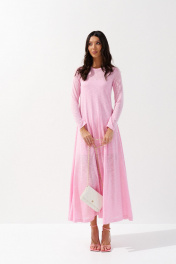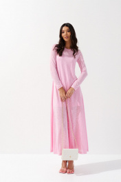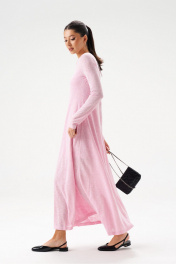 Комплект состоит из двух платьев: платье на бретелях и платья полуприлегающего силуэта. Выполнен из полупрозрачного трикотажного полотна нежно-розового цвета. Характеристики:нижнее платье полуприлегающего силуэта, А-образный силуэт, бретели - не регулируемые. Длина по спинке 64 см. Верхнее платье полуприлегающего силуэта, А-образный силуэт, горловина овальная, рукав втачной. Длина по спинке 130 см, длина рукава 62 см.