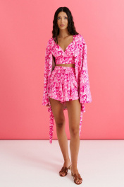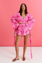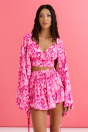 Комплект состоит из топа, кардигана и шорт выполнен из ткани с принтом сердца. Характеристики: Кардиган прямой крой , подкладка, плавный срез горловины, рукав широкий с разведением к низу втачной, по лини талии нашиты шлевки, в комплекте пояс из ткани основного изделия. Длина кардигана по спинке 80, длина рукава 78 от края горловины. Топ укороченный, фигурный вырез горловины, узкие бретели, по спинке резинка со сборкой, по переду под лифом стабильная вставка, застежки в изделии нет. Длина топа 28 см. Шорты свободного кроя, пояс на резинке со сборкой с кулиской, по бокам имитация запаха, низ изделия с планым срезом. Длина 32 см.