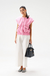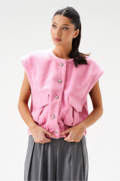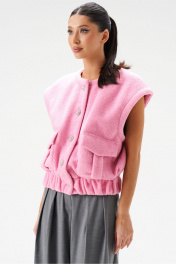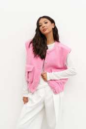 Жилет прямого кроя выполнен из приятного, теплого полотна розового цвета. Характеристики: прямой крой, горловина круглая отстроченная, подкладка, застежка центральная на акцентыны петли пуговицы, по переду крупные накладные карманы, низ изделия на резинке. Длина по спинке 53 см.