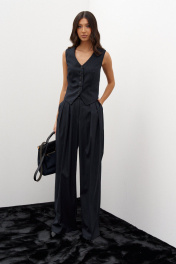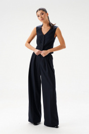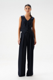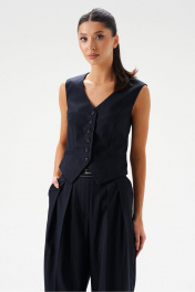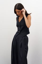 Жилет прямого свободного кроя выполнен из полотна тёмно-синего цвета в тонкую полоску. Характеристики однобортный, прямой крой, подкладка, прорезные карманы обманки, застежка центральная на петли - пуговицы, низ изделия по переду с фигурным низом. Длина по спинке 43 см.