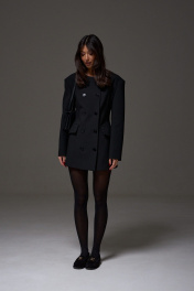 Жакет полуприталенного силуэта выполнен из текстильного полотна черного цвета. Характеристики: полуприталенный силуэт, двубортный, брендированная подкладка, подплечники, овальный вырез горловины, по переду функциональные карманы с клапаном, рукав втачной, по низу рукава нашиты пуговички. Длина по спинке 76, длина рукава 61 см.