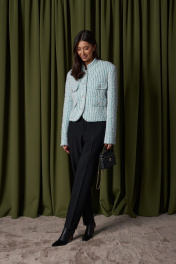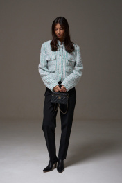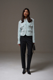 Жакет прямого свободного кроя, выполнен из фактурного твидового полотна. Характеристики: горловина стойка, застежка центральнаяна петли пуговицы, подплечники, рукав прямой, внутри брдендированная подкладка. На уровне линии груди декоративные карманы с клапаном, внизу накладные карманы с клапаном. Длина по спинке 53 см, длина рукава 65 см.