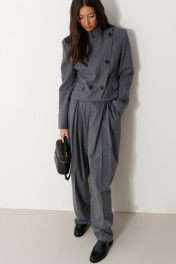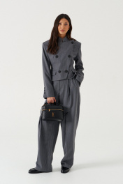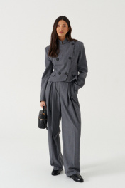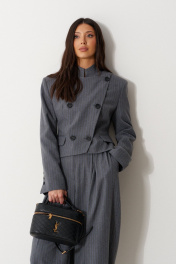 Жакет укороченный полуприталенного силуэта, выполнен из текстильной, чуть ворсистой ткани, серого цвета в узкую полоску. Характеристика: полуприталенный силуэт, вороник-стойка, центральная застежка на пуговицы слегка на запах, слева на груди имитация прорези для кармана, чуть ниже талии имиьация карманов с клапанами, подплечники, рукав втачной с небольшим разрезом застегивающимся на пуковицы, по переду и сзади изедлия простроченные выточки, спинка с центральным швом. длина рукава от шва втачивания 64см. Длина изделия по центру спинки 54см.