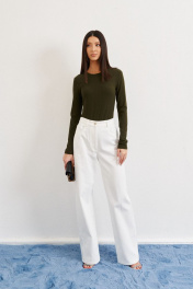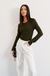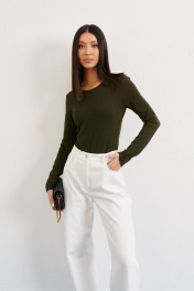 Боди прилегающего силуэта выполнен из тонкого фактурного трикотажного полотна. Характеристики: прилегающий силуэт, плавный вырез горловины, рукав втачной, по спинке глубокий плавный вырез, по низу застежки на две кнопки. Длина от верхнего края плеча до нижнего края изделия 84 см, длина рукава 62 см.