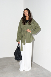 Блузон прямого свободного кроя. Выполнен из мягкого денима цвета хаки. Характеристики: прямой свободный крой, рукав спущеный, по линии талии шлевки, пояс в комплекте. Застёжка центральная на пуговицы, по переду изделия один накладной карман. Над манжетом защипы, манжет застёгивается на три пуговицы. Длина по спинке 75 см, длина рукава от края горловины 73 см.