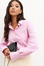 Рубашка приталенного силуэта выполнена из хлопкового розового полотна с принтом вертикальная белая полоска. Характеристики:Приталенный силуэт, отложной воротник на стойке, застежка центральная на петли пуговицы, по низу рукава манжета на пуговичке. Спинка цельнокройная. Длина 83 см, длина рукава 81 см (от края горловины).