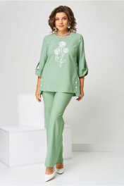 Костюм женский полуприлегающего силуэта из костюмной летней ткани. Горловина округлая, рукав 3/4 на пате. Перед с рельефами до низа, с шлицами на пуговицах. Спинка с плечевыми вытачками. Брюки на поясе с резинкой, застежка на гульфик, на тесьму-молнию, вверху косые карманы. Отделкой изделия является абстрактная печать по центру переда. Длина изделия блузка: 71 (±1) см.; брюки: 101 (±2) см. Длина рукава 42 (±1) см. Объём груди размер 52 – 110 (±2) см. размер 54 – 114 (±2) см. размер 56 – 118 (±2) см. Объём талии блузка: размер 52 – 110 (±2) см. размер 54 – 114 (±2) см. размер 56 – 118 (±2) см. брюки: размер 52 – 83 (±2) см. размер 54 – 87 (±2) см. размер 56 – 91 (±2) см. Объём бёдер брюки: размер 52 – 128 (±2) см. размер 54 – 132 (±2) см. размер 56 – 136 (±2) см. блузка: размер 52 – 112 (±2) см. размер 54 – 116 (±2) см. размер 56 – 120 (±2) см. Ширина рукава под проймой размер 52 – 19 (±1) см. размер 54 – 20 (±1) см. размер 56 – 21 (±1) см. Ширина спинки 42 (±0,5) см.;