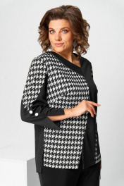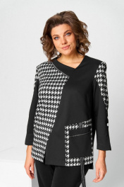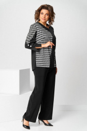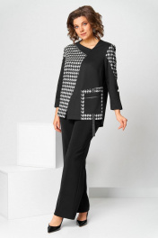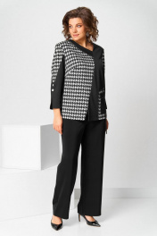 Костюм брючный (двойка) женский полуприлегающего силуэта, состоит из джемпера и брюк. Костюм выполнен и трикотажного полотна и брючной ткани. Джемпер без застежки, рукав длинный с фигурной вставкой. По низу разрез. Горловина фигурная V-образная со вставкой, декорированной тесьмой с имитацией "молнии". Перед с асимметричным подрезом в области бедра вставка с карманом с отделочной тесьмой. По переду внизу разрез по рельефу. По боковым швам внизу разрезы. Спинка свободная. Брюки классические, со стрелками на поясе с резинкой. Застежка на гульфик, на тесьму-молнию. Вверху косые карманы. джемпер - 72 (±1) см., брюки - 101 (±2) см. Длина рукава 53 (±1) см. Вид застёжки брюки - гульфик на молнию Объём груди джемпер: размер 52 – 118 (±2) см.; размер 54 – 122 (±2) см.; размер 56 – 126 (±2) см. Объём талии джемпер: размер 52 – 113 (±2) см.; размер 54 – 117 (±2) см.; размер 56 – 121 (±2) см. брюки: размер 52 – 86 (±2) см.; размер 54 – 90 (±2) см.; размер 56 – 94 (±2) см. . Объём бёдер брюки: размер 52 – 112 (±2) см.; размер 54 – 116(±2) см.; размер 56 – 120 (±2) см. Ширина рукава под проймой размер 52 – 19 (±1) см.; размер 54 – 20 (±1) см.; размер 56 – 21 (±1) см. Ширина спинки 42 (±1) см.