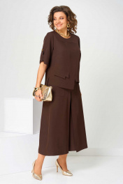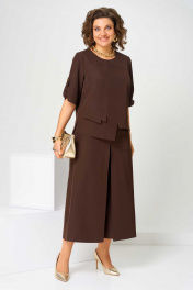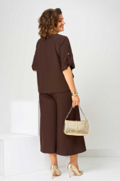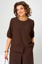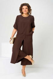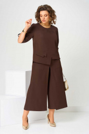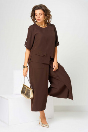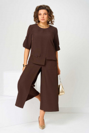 Костюм женский свободного силуэта, выполнен из костюмной ткани. Блузка с рукавами 7/8. Перед с ассиметричной кокеткой и рельефом, ниже уровня талии фигурный клапан. Спинка свободная. Низ блузки фигурный разноуровневый. Юбка-брюки на кокетке, с накладными карманами. Застежка на тесьму-молнию в боковом шве. Длина изделия блузка: 62 (±1) см. юбка-брюки: 85 (±2) см. Длина рукава 52 (±1) см. Объём груди размер 50 – 112 (±2) см размер 52 – 116 (±2) см размер 54 – 120 (±2) см Объём талии блузка: размер 50 – 112 (±2) см. размер 52 – 116 (±2) см. размер 54 – 120 (±2) см. юбка-брюки: размер 50 – 88 (±2) см. размер 52 – 92 (±2) см. размер 54 – 96 (±2) см. Объём бёдер размер 50 – 112 (±2) см размер 52 – 116 (±2) см размер 54 – 120 (±2) см Ширина рукава под проймой размер 50 – 18 (±1) см. размер 52 – 19 (±1) см. размер 54 – 20 (±1) см. Ширина спинки 42 (±0,5) см.
