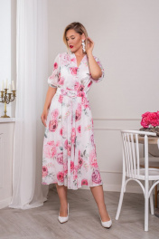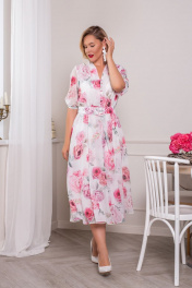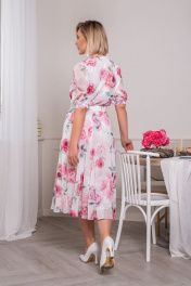 Платье выполнено из нежного на ощупь полотна с вискозой, на подкладке. Отрезное по линии талии, нижняя часть платья (юбка) со сборкой по линии талии, длиной миди. Рукав втачной оформлен манжетой с частичной сборкой на мягкую резинку, длиной 3/4, . Застежка на пуговицах-петлях до линии талии. К платью прилагается съемный пояс в цвет изделия с обтяжной пряжкой.