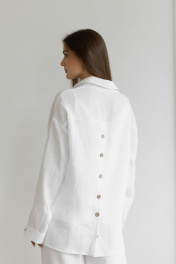 Костюм выполнен из 100% умягченного льна, который прошел специальную энзимную обработку, поэтому изделие не колется и не дает усадки. Состоит из шорти и рубашки. Рубашка свободная, прямая, со спущенным плечом и длинным рукавом с манжетой. Застежка центральная на петли и пуговицы. Воротник рубашечный, по переду карманы. По спинке сделана глубокая шлица на пуговицах. Шорты прямые, с карманами, по талии на резинке.