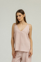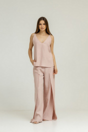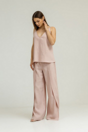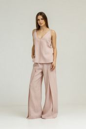 Комплект выполнен из умягченного льна,который прошел специальную энзимную обработку,поэтому изделие не колется и не дает усадки.Брюки палаццо,высокой посадки,пояс частично на резинке.Застежка на молнию и петлю с пуговицей,в боковых швах карманы.По передним половинкам брюк выполнена складка и высокий разрез.Топ прямой с глубоким вырезом по переду и спинке,на тонких бретелях.
