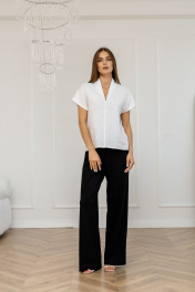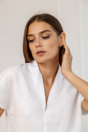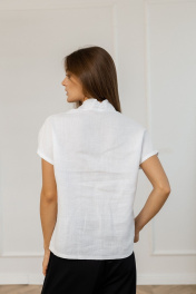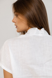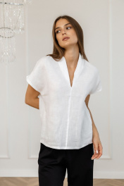 Блуза выполнена из льна, который прошел специальную энзимную обработку, поэтому изделие не колется и не дает усадки. Блуза со спущенным коротким рукавом, прямого силуэта. Воротник стойка переходящая в глубокий вырез.