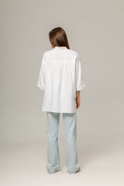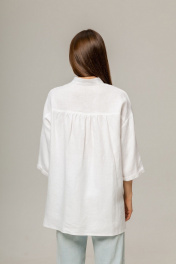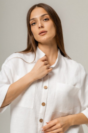 Рубашка выполнена из умягченного льна,который прошел специальную энзимную обработку,поэтому изделие не колется и не дает усадки.Рубашка свободная ,прямая,со спущенным плечом. Застежка центральная на петли и пуговицы. Воротник рубашечный,по переду карманы.По спинке кокетка и сборка.