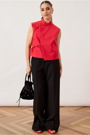 Жилет женский, прямого силуэта, выполнен из плотной костюмной ткани. Модель с воротником-стойкой и глубоким асимметричным запахом на правую сторону. Главной декоративной особенностью изделия являются две пары функциональных завязок из основной ткани, расположенных по правому борту, которые фиксируются на мягкие банты. Перед и спинка с талиевыми вытачками для обеспечения легкого прилегания. Линия плеча укорочена, пройма обработана обтачкой вчистую. Спинка со средним швом. Изделие на подкладке.