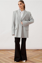 Жакет мужского кроя (оверсайз) выполнен из костюмной ткани светло-серого цвета, на притачной подкладке. Модель прямого свободного силуэта с акцентной расширенной линией плеча. Воротник классический пиджачного типа с острыми лацканами. Центральная застежка на одну декоративную пуговицу контрастного светлого оттенка. Полочка с нагрудным прорезным карманом с листочкой слева и двумя функциональными горизонтальными прорезными карманами с клапанами в нижней части изделия. Рукав втачной, длинный, двухшовный, свободного прилегания. Спинка со средним швом и шлицей для свободы движения. Нижний край жакета обработан классическим швом вподгиб