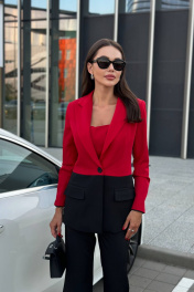 Костюм 3-х предметный: жакет + топ + брюки. Жакет однобортный. Жакет на подкладке, застёгивается на 1 пуговицу. Рукава втачные. Имеет рельефы для прилегания по фигуре. Воротник отложной, костюмный. Топ на бретелях, обработана потайная молния в цвет изделия в боковом шве. Брюки-клеш, имеют фигурную волнообразную шлицу по переду, карманы в боковых швах. Пояс притачной, застежка - молния и пуговица.