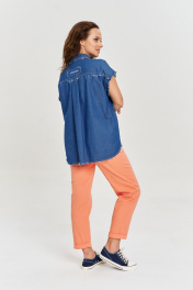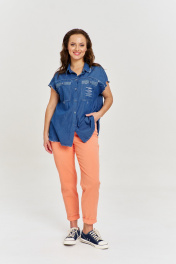 Рубашка из тонкого хлопкового джинса, свободного силуэта, удлиненной спинкой, застежкой на пуговицы спереди и рубашечным воротником. Спинка с отрезной кокеткой и бантовой складкой. Рукав короткий, цельнокроеный. На переде отрезные кокетки и накладные карманы с авторским принтом. Некоторые швы изделия необработаны, при энзимной стирке обретают стильную вытрепанность.