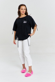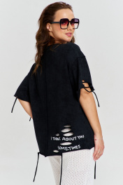 Футболка из хлопковой кулирки с "мраморным" принтом, свободного силуэта, с коротким рукавом и круглой горловиной. Перед и спинка со средними швами налицо. На переде накладной карман. Изделие декорировано авторскими принтами и эффектными прорезями.