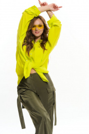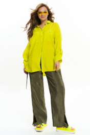 Брюки из вискозной струящейся ткани, прмого силуэта, с объемными накладными карманами с клаапанами и декоративными патами. На уровне колена вставка с вытачками. Пояс с резинкой. По низу брюк - разрезы с застежкой на пуговицы, с помощью которых можно регулировать ширину брюк.