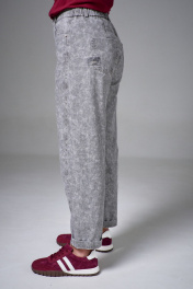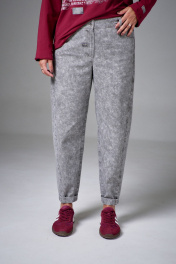Джинсы из "мраморного" хлопка, с четырьмя функциональными карманами и поясом с резинкой на спинке. Боковые швы брюк переходят на перед. Изделие проходит энзимную стирку.