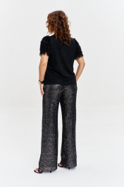 Эффектные брюки из хлопковой сетки с пайетками, прямого силуэта, с трикотажным поясом на резинке. По всей длине брюк мягкая трикотажная подкладка, что делает их невероятно комфортными.