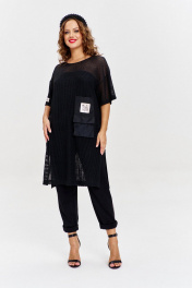 Брюки из плотного трикотажа с рубчиком, зауженные к низу, с боковыми карманами спереди и накладными сзади. Пояс - декоративная резинка . По бокам брюк - золотистый лампас из ленты с пайетками.