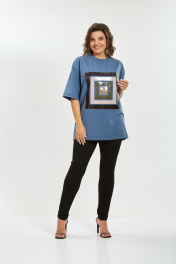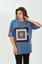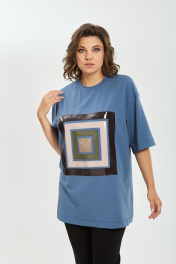 Майка свободного силуэта, со спущеным рукавом. Рукав короткий, чуть ниже локтя. По центру переда декор из лаковой кожи. Длина плеча-21,5см, длина рукава-29см, длина по спинке-82см. Параметры модели: обхват груди-98см, обхват бедер-110см, размер изделия на модели 50.