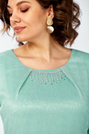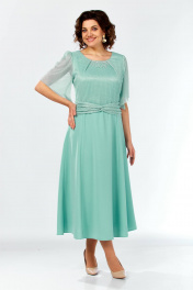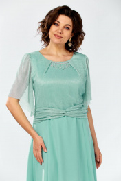 Платье женское нарядное, комбинированное их двух видов ткани:однотонной плательной и мелкой плиссированной с лёгким мерцающим блеском. Изделие отрезное по линии талии с драпировкой, вырез горловины-полукруглый с украшением из камешков, рукав расклешённый укороченный, фигурный по низу. Застёжка на молнию с среднем шве спинки, низ изделия расклешённый. Изделие на подкладке.