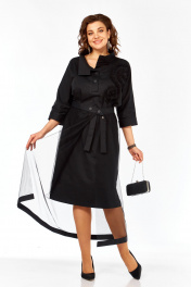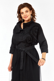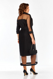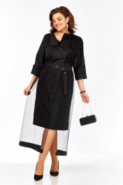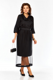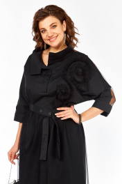 Нарядный женский комплект состоит из свободного платья-рубашки ,выполненного из плательно-костюмной ткани "Шуршун" и прозрачной юбки назапах, выполненной из сетки. Платье прямого силуэта , "оверсайз", с цельнокроеным рукавом длиной 3/4, заканчивающимся притачной отложной манжетой, выполнено из двух видов ткани. Перед с втачными планками по горловине и центральной застёжкой на 2 кнопки, и декоративным элементом из сетки. Воротник - стойка. Спинка с отрезной кокеткой из сетки и средним швом. В боковых швах разрезы. Юбка силуэта трапеция со складками по верхнему срезу,на притачном поясе с застёжкой на кнопки. По низу притачная планка из основной ткани.