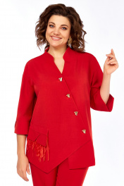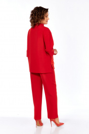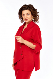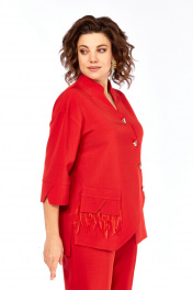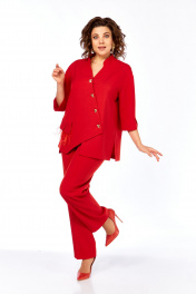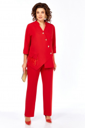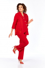 Женский двухпредметный нарядный костюм состоит из асимметричного жакета и брюк, выполненных из однотонной плательно-костюмной ткани. Жакет прямого силуэта с асимметричной застёжкой на 4 петли и пуговицы.Воротник-стойка цельнокроеный.Плечи спущены.Рукава длиной 3/4 одношовные,низ на притачных манжетах внахлёст. Спинка цельная.На переде клапан с декоративной тесьмой с перьями (для стирки рекомендуется снять).Низ переда фигурный.По бокам разрезы.Жакет без подкладки. Брюки прямые зауженные к низу,на притачном поясе с резинкой по бокам,и застёжкой на тесьму-молнию и петлю и пуговицу.Брюки со стрелками.