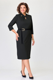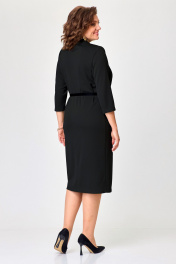 Платье женское трикотажное. Спинка со средним швом. По переду отрезная кокетка в области плеча и мягкие складки в верхней части лифа. Рукав втачной, одношовный. Длина рукава – ¾. Воротник-стойка мягкой формы с растяжкой по спинке, на навесные петли и пуговицы. Соединение воротника и переда образует декоративный элемент платья. Данная модель платья прекрасно вписывается в рамки офисного, а также праздничного образа. Завершающим элементом к образу служит съемный пояс с пряжкой, подчеркивая всю элегантность образа.
