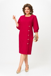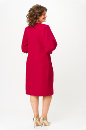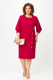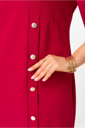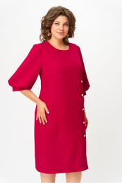 Платье женское, полуприлегающего силуэта. Спинка со средним швом. Перед ассиметричного кроя, с нагрудными вытачками и смещенной планкой, которая фиксируется на 5 пуговиц. Рукав втачной одношовный, на притачной манжете по низу. Длина рукава ¾. К низу рукав с дополнительным объемом, созданным глубокими складками с фиксацией на подкладку. Горловина круглой формы, обработана обтачками. Застежка на потайную молнию в среднем шве спинки.