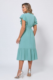 Это женственное платье X-образного силуэта длины миди с интересными деталями - стильное заявление для особых моментов. Нежный цвет и приятная к телу немнущаяся ткань придают модели элегантный вид. Красивая отделка оборками и жабо добавляет выразительности, а разрез по переду красиво смотрится во время движения. Ювелирные пуговицы по планке спереди несут не только функциональный характер, но и добавляют изысканности образу. Скрытая резинка на талии обеспечивает удобную посадку. Тонкий поясок можно завязать бантом, который станет ещё одним украшением платья.