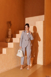 Женский оригинальный комплект с акцентными деталями из эффектной ткани! Созданный отличительным кроем с подчеркнутыми деталями, комплект задаст уверенное настроение образу и подчеркнет индивидуальность при любом случае выхода. Выразительный комплект состоит из жакета, брюк и блузки. Верхний слой выполнен из мягкой смесовой ткани с натуральными волокнами вискозы, практичный в носке. Блузка – из мягкого вискозного полотна, приятного к телу. Жакет полуприлегающего силуэта, двубортный, асимметричный разноуровневый. На подкладке. Передняя часть из двух половинок, с вертикальными рельефами от проймы. На правой полочке расположен прорезной нижний карман с обтачкой и клапаном, вырез горловины оформлен пиджачным воротником с лацканом. Левая полочка укорочена и без дополнительных элементов. Спинка со средним швом и с вытачками от подреза на талии. Низ спинки асимметричный. Рукав втачной, двухшовный, длинный. Застёжка центральная на видимую и потайную петли и пуговицы. Низ борта округлый. Брюки свободного силуэта расширенные вверху и слегка зауженные к низу, длиной до щиколотки, с двумя верхними боковыми карманами и двумя заложенными глубокими складками от пояса спереди. Высота сиденья классическая. Брюки на притачном поясе, по кругу которого вставлена резинка. Блузка полуприлегающего силуэта. Горловина округлой формы. В боковых швах снизу разрезы. Перед цельный, с двумя нагрудными вытачками от бокового шва. Спинка разрезная по среднему шву с двумя вытачками на уровне талии. В верхней части среднего шва предусмотрен небольшой разрез с фиксацией на одну навесную петлю и пуговицу.