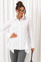 Созданный отличительным кроем с подчеркнутыми деталями, комплект задаст уверенное настроение образу и подчеркнет индивидуальность при любом случае выхода. Выразительный комплект состоит из жилета, брюк и рубашки, выполнен из смесовой ткани с натуральными волокнами, практичен в носке. Жилет полуприлегающего силуэта, двубортный, асимметричный разноуровневый. На подкладке. Передняя часть из двух половинок, с вертикальными рельефами от плеча. На левой полочке расположен прорезной нижний карман с обтачкой и клапаном, вырез горловины оформлен пиджачным воротником с лацканом. Правая полочка укорочена и без дополнительных элементов. Спинка со средним швом и с вертикальными рельефами от плеча. Правый рельеф заканчивается функциональным разрезом-шлица. Застёжка смещенная на потайные петли и пуговицы. Низ борта округлый. Дополнительным элементом служит декоративный пояс из экокожи. Брюки классические, длиной до щиколотки, слегка заужены внизу, с высокой посадкой. В верхней части спереди брюк расположены функциональные карманы и складки от пояса. Застежка центральная на молнию. Пояс широкий, с застёжкой на две пуговицы. В задней части пояса брюк вставлена резинка. Блузка рубашечного типа выполнена из хлопковой ткани. Передняя часть блузки с нагрудными вытачками и с подрезными боковыми частями. Спинка цельная по середине, с подрезными боковыми частями и защипами на талии. Блузка с декоративными вставками в нижней части, которые задают силуэтное расширение в области бедер. Нижний край блузы неровный. Воротник рубашечный, на стойке. Застежка центральная на петли и пуговицы. Рукав длинный, одношовный, втачной. Нижний край рукава обработан широкой манжетой с застежкой на петлю и пуговицу. При желании потребителя манжета может быть использована в подвернутом виде. Длина жилета (по среднему шву спинки) – 69 см. Длина рукава жакета – 21,5 см Длина брюк (по боковому шву с поясом) – 100 см.