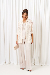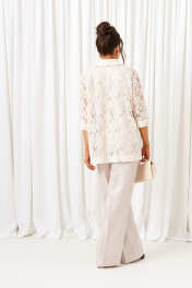 Комплект с блузкой из кружева, брюк и топа – изделие вне времени и трендов, созданное в различных интерпретациях: от оверсайза до классики. Предназначен для повседневного и выходного использования. Найдет применение в любую погоду. Блузка свободного силуэта выполнена из смесового полотна с содержанием вискозы. Передняя часть из двух половинок с нагрудными вытачками от бокового шва. Спинка цельная. Рукав одношовный втачной длиной ¾ свободный. Воротник классический стояче-отложной на цельнокроеной стойке. Без застёжки. Низ изделия ровный, в боковых швах предусмотрены высокие разрезы. Топ полуприлегающего силуэта, выполнен из тонкого смесового вискозного полотна. Перед цельный, с двумя нагрудными вытачками от бокового шва. Спинка цельная. Горловина округлой формы. Низ слегка закруглен к боковым участкам. Брюки длинные, прямые свободные; выполнены из смесового вискозного полотна. Посадка классическая, высокая. Застежка центральная на молнию и петлю с пуговицей на поясе. Спереди расположены боковые функциональные карманы. Пояс притачной, сзади на резинке, шириной 4см.