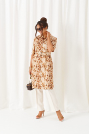 Универсальный комплект из блузки, брюк и топа – изделие вне времени и трендов, созданное в различных интерпретациях: от оверсайза до классики. Выполнен из смесового полотна с содержанием натуральных волокон – льна и вискозы, предназначен для повседневного и выходного использования. Найдет применение в жаркую и прохладную летнюю погоду. Блузка удлинённая, свободного силуэта. Передняя часть распашная с нагрудными вытачками от бокового шва. Вверху расположены функциональные накладные карманы с клапанами. Спинка с кокеткой в верхней части. Рукав одношовный втачной длиной до локтя, свободный. Воротник стояче-отложной на стойке. Застежка центральная на петли и пуговицы. Низ изделия ровный, в боковых швах предусмотрены высокие разрезы. Топ полуприлегающего силуэта. Перед цельный, с двумя нагрудными вытачками от бокового шва. Спинка со средним швом, оформленным у горловины разрезом с фиксацией на навесную петлю и пуговицу. Горловина округлой формы. Брюки длинные, умеренной ширины. Посадка классическая. Спереди расположены боковые функциональные карманы. Застежка центральная на молнию и петлю с пуговицей на поясе. Пояс притачной, сзади на резинке, шириной 4см.