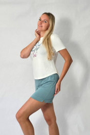 Комбинированный комплект состоит из шорт и футболки выполнен из вискозного трикотажного полотна. Футболка с коротким втачным рукавчиком, на груди - эффектная печать. Шорты выполнены из однотонного трикотажного вискозного полотна, пояс на резинке. Отличный комплект для сна и отдыха.