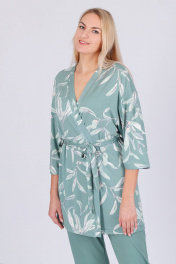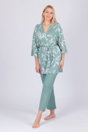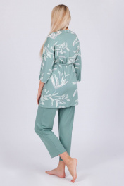 Трикотажный комплект состоит из набивного короткого халатика на запах и однотонных брюк. Брюки прямые с карманами, пояс на широкой резинке.