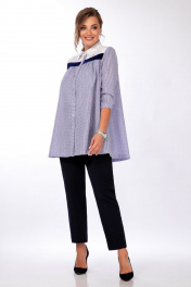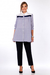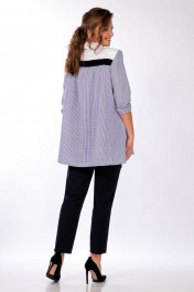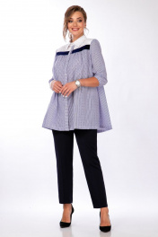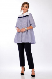 Костюм женский двухпредметный,состомт из блузки и брюк.Блузка А-образного силуэта,воротник рубашечный на стойке,застежка центрально - бортовая ,выполнена из хлопковой ткани двух цветов.По кокетке,по спинке и полочке сборка,рукав втачной 3/4,внизу на резинке.Брюки классические с высокой посадкой,полуприлегающего силуэта,выполнены из костюмной ткани с добавлением эластана.Пояс без резинки с застежкой молнией на пуговицу.В боковых швах карманы с листочкой.Длина брюк 103 см.