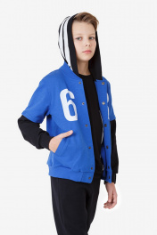 Жакет с капюшоном на кнопках с прорезными карманами из трехниточного футера флам. Рукав втачной, с подрезом, комбинированный по цвету. Горловина, манжеты рукавов и пояс выполнены из рибаны. Модель декорирована лаконичной одноцветной трафаретной печатью.