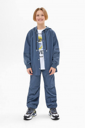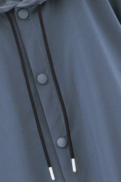 Трендовый жакет-рубашка с капюшоном в оттенке деним. Модель прямого объёмного силуэта с эффектом многослойности. Спущенная линия плеча. Манжеты из рибаны. Комфортная застёжка на кнопки. Комбинация материалов: футер и твил. Карманы в шве. Шрифтовой принт